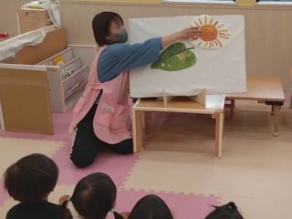 4月の行事は『はらぺこあおむし』のパネルシアターを見ました。 -