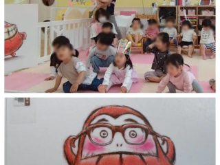 4月の誕生会では『だるまさんの』の大型絵本を見て、みんな一緒にゆらゆら♪