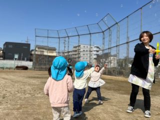 ボール遊びをしたり、しゃぼん玉を追いかけたり、電車ごっこをしたり、たくさん体を動かして遊ぶことができました!