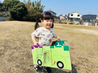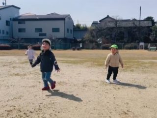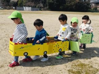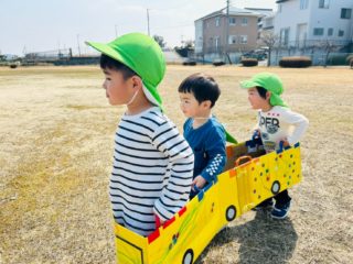 風に乗ったたくさんのしゃぼん玉を追いかけたり、電車ごっこを楽しみました。