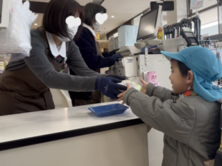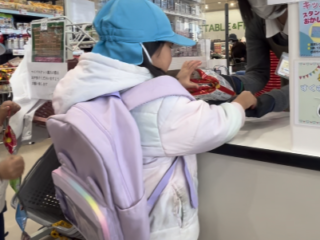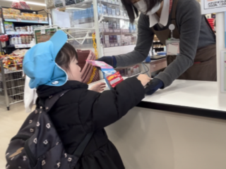1人ずつ商品とお金を渡し、レシートとお釣りをもらい、「ありがとう!」も言えました(^-^)