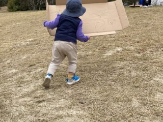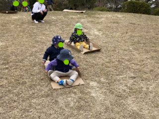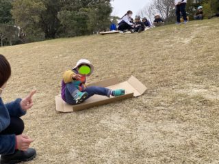 またダンボールにお絵かきしたそりを持っていき、芝生の坂ですべり台ごっこをしてみました。