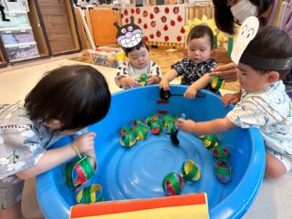 スイカのヨーヨーすくいは、先生がやり方を見せると、まねをしてやってみようとしていました。