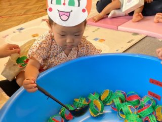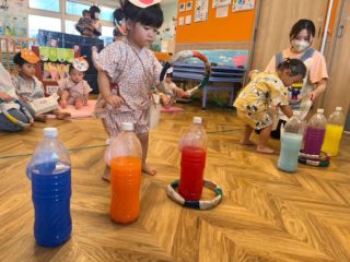 スイカのヨーヨーすくいは、おたまですくえてもすぐにコロっと落ちてしまったり、ちょっと難しそう。