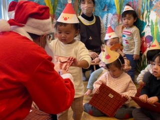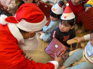 楽しみにしていたのに、いざ目の前にサンタさんが現れると、緊張で固まっている子もたくさんいました(^-^)