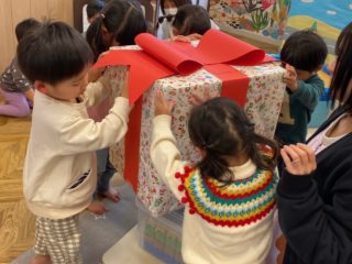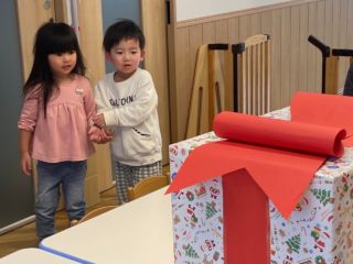 「サンタさんがまだ近くにいるかもしれないから、ありがとうって言おう!」とみんなで大きな声でお空に向かって「ありがとう!!」を言いました。