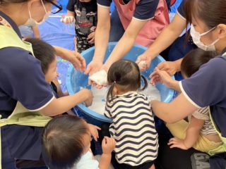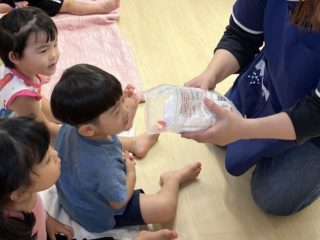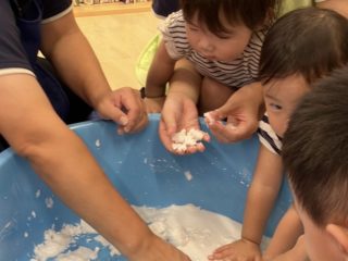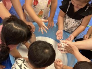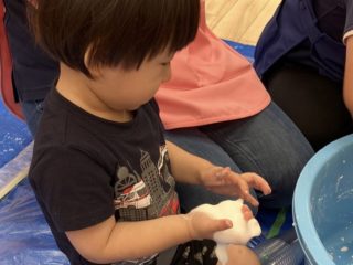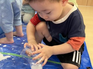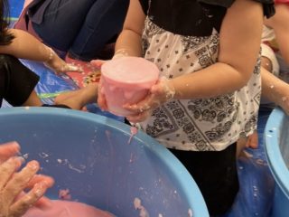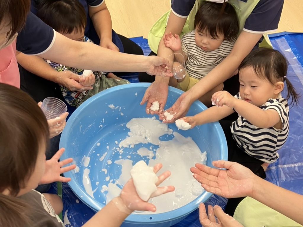 今回の素材あそびはスライムの不思議な感触をみんなで体験。