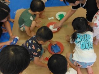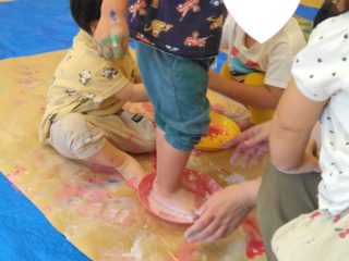 新しい紙がくると足も絵具につけてぺたぺた歩いてスタンプを楽しむ子どもたちでした。