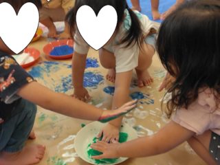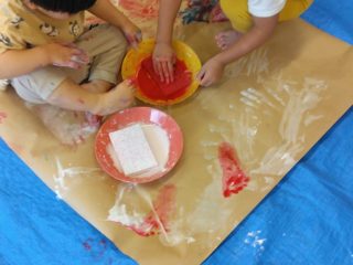 えのぐが用意され、躊躇なく手をつける子もいれば、周りを様子見している子も・・・