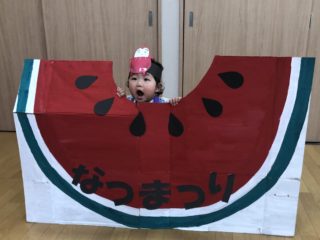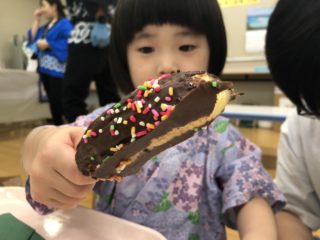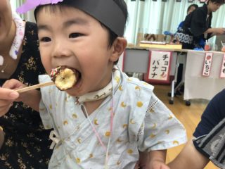 お菓子釣り、金魚すくいのゲームコーナー、お面を作る製作コーナー、屋台にはかき氷、チョコバナナ、ベビーカステラ、調理員さんが作る焼きそばを準備しました。
