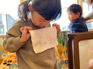 よーいドン!で床を拭いたり、自分たちが毎日使っているテーブルや椅子はもちろん、壁やベビーゲートなど「ここふいていい?」と拭けるところを探してピカピカにしてくれました☆
