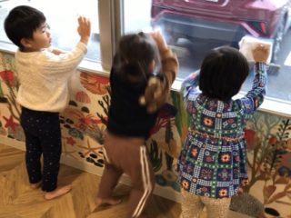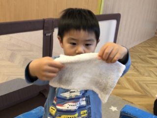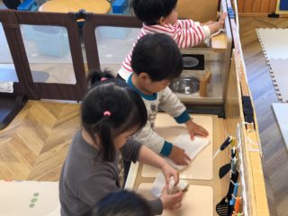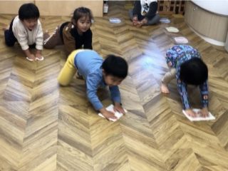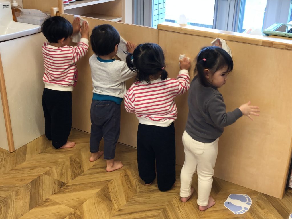 「いっしょにやろう!」とお友だちに声をかけたり、お友だちを見て負けじと力を込めて拭いたりと、積極的です。