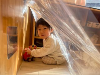 室内でボールプールやカラーボールをテープに貼って楽しんでいます。