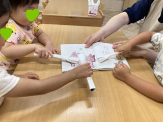 歯磨きの絵本の読み聞かせが始まると、手作りの歯ブラシを持って絵本のノンタンにみんなで