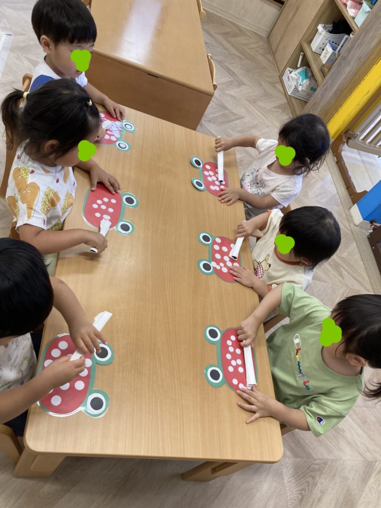 カエルさんのお口に歯に見立てた白丸シールをペタペタ貼って遊びました。