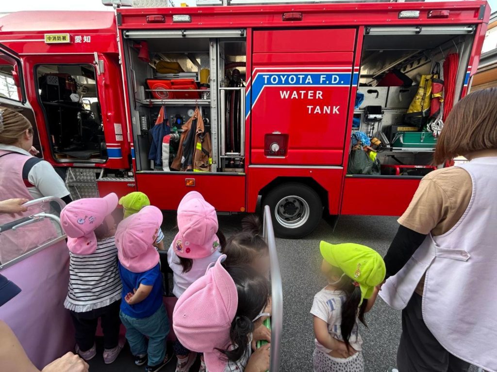 消防署の方が消防車に乗って、園内の点検に来てくれました。