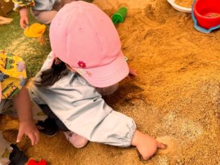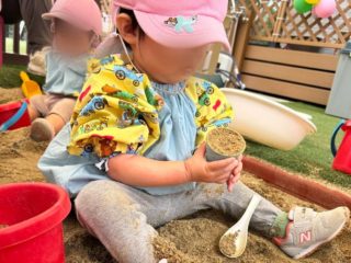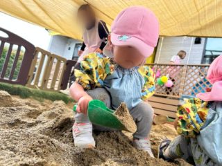 園庭の砂場では、子どもたちが散歩とは違う表情を見せています。
