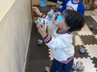鬼さんが窓からのぞくと、子どもたちは自分で作った新聞紙のお豆を