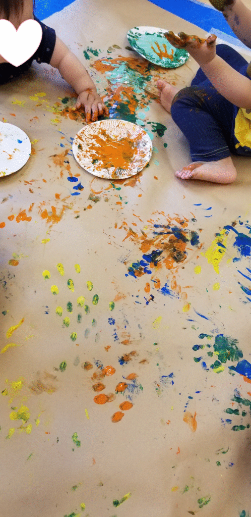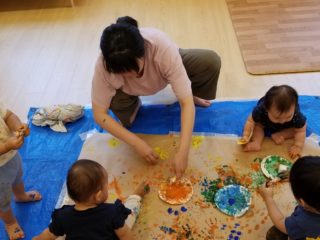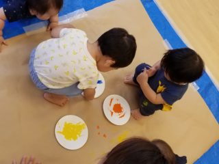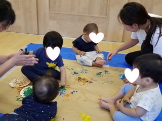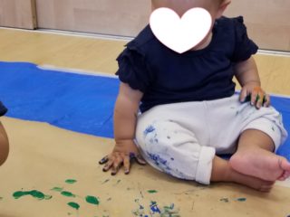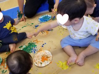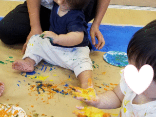 最初は戸惑っていた子も気づけば、絵の具がたくさんおててについていました -