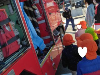 大きな消防車が園に来て、わあーと声をあげる子どもたちでしたよ☺