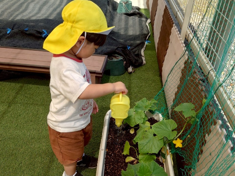 水をあげたり、ながめたり、夏の収穫をみんなで楽しみにしています。