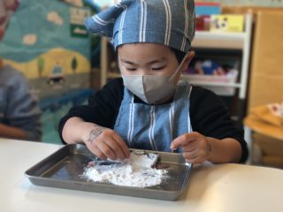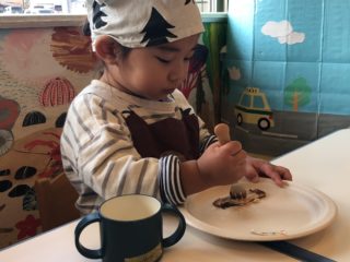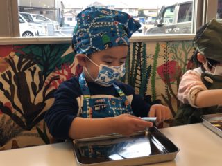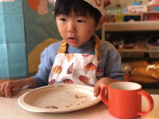 終わってからは、自分で畳んで袋にしまったエプロンを見せてくれたり、「おさかなたべたよ!」と嬉しそうに報告をしてくれました♡