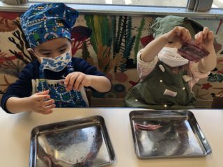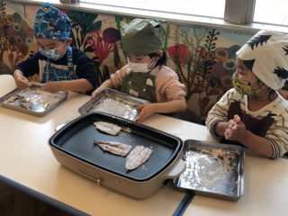頭の付いた丸一匹のイワシを手にとって観察したり、節分のお話や、命をいただくことなどをしっかりと聞いていました。