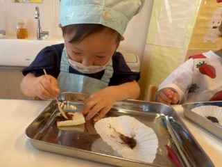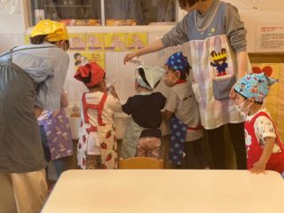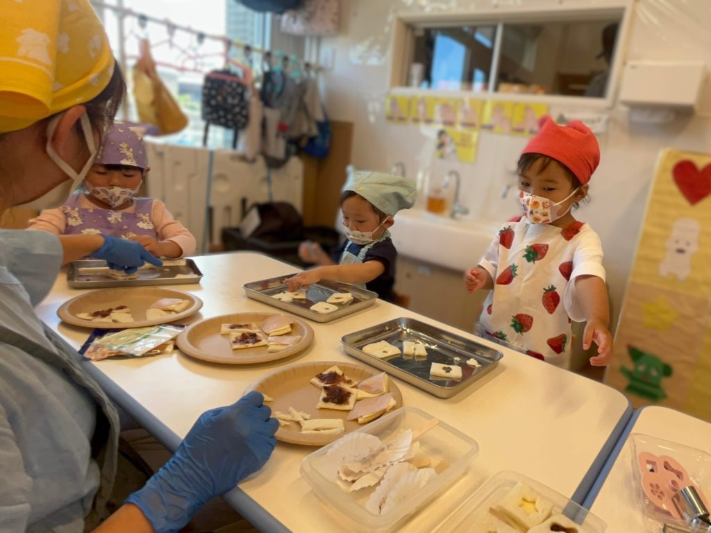 2歳児さん達は「エプロンつけてクッキングするんだ♪」と、とっても楽しみにしていました!