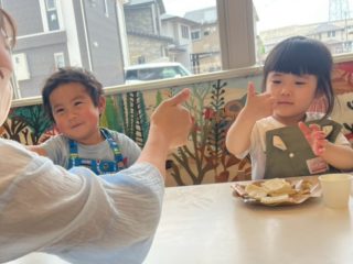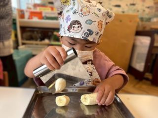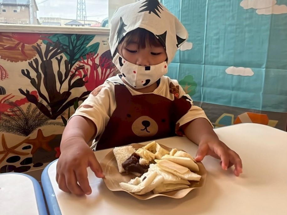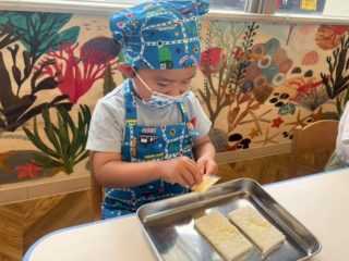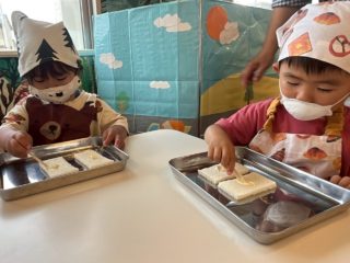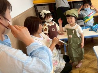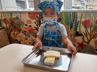 この日に向けて、エプロンを着る練習をしてパン屋さんごっこをしたり、先生にサンドイッチの絵本を読んでもらったりして、イメージを膨らませてきました!