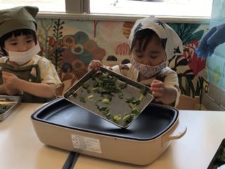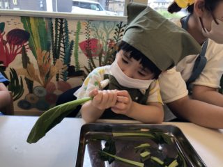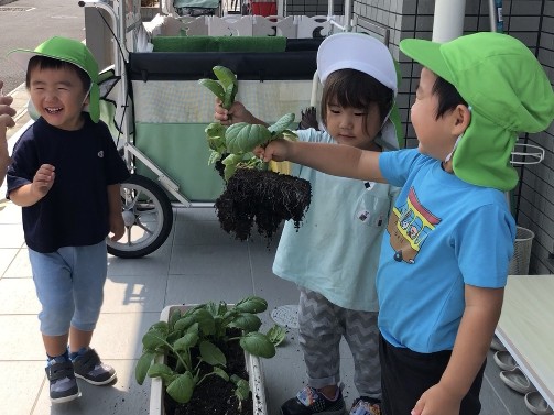 2歳児さんが育てた小松菜が立派に育ち、収穫をしました!