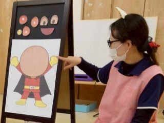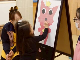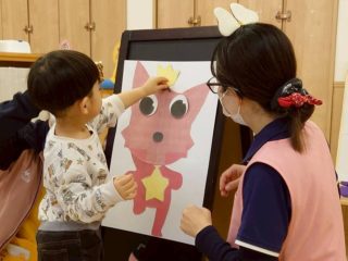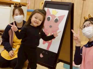 新年のあいさつを英語で言ったり、福笑いをしたり、