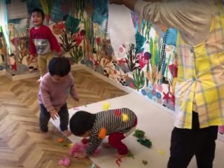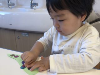 くしゅくしゅ丸めた色とりどりのお花紙を床に散りばめ、よーいドンで細長いビニール袋にたくさん入れていきました。