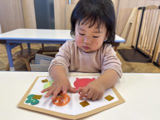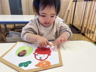 だるまさんの顔のパーツや、松や梅の飾りなどを貼りました。