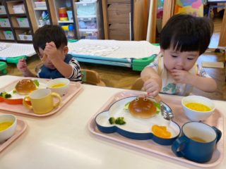 0歳児さんも、お化けの顔を楽しんでから、小さくちぎって食べました☆