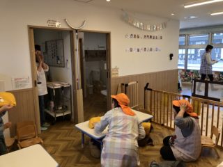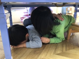 子どもたちは、地震と分かると自分で近くのテーブルのもぐれる場所を探したり、煙を吸わないように口を抑えて外に出ることができました。