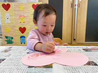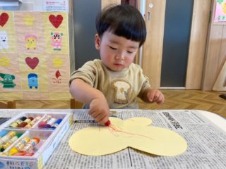 ひよこ組さんは、大きなちょうちょとイチゴにお絵かきをしました。