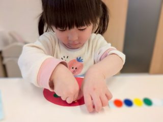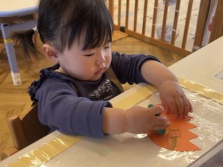 うさぎの顔のパーツをシールで貼ったり、オレンジ色の足型スタンプは、うさぎさんの大好物のニンジンになりました!