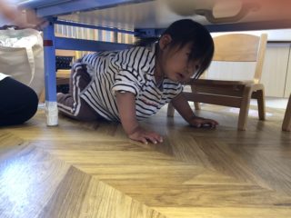 2歳児さんは、テーブルにもぐり、頭を守りました!