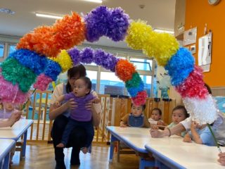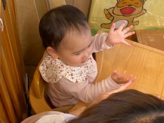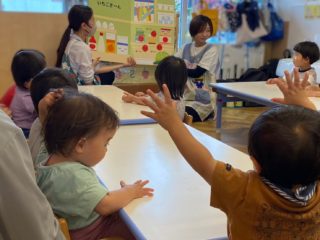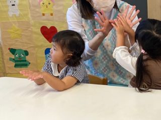 難しい手の動きを頑張ってまねしようとする2歳児さん、歌に合わせて手をたたいたり体を揺らして楽しそうな0、1歳児さん♪