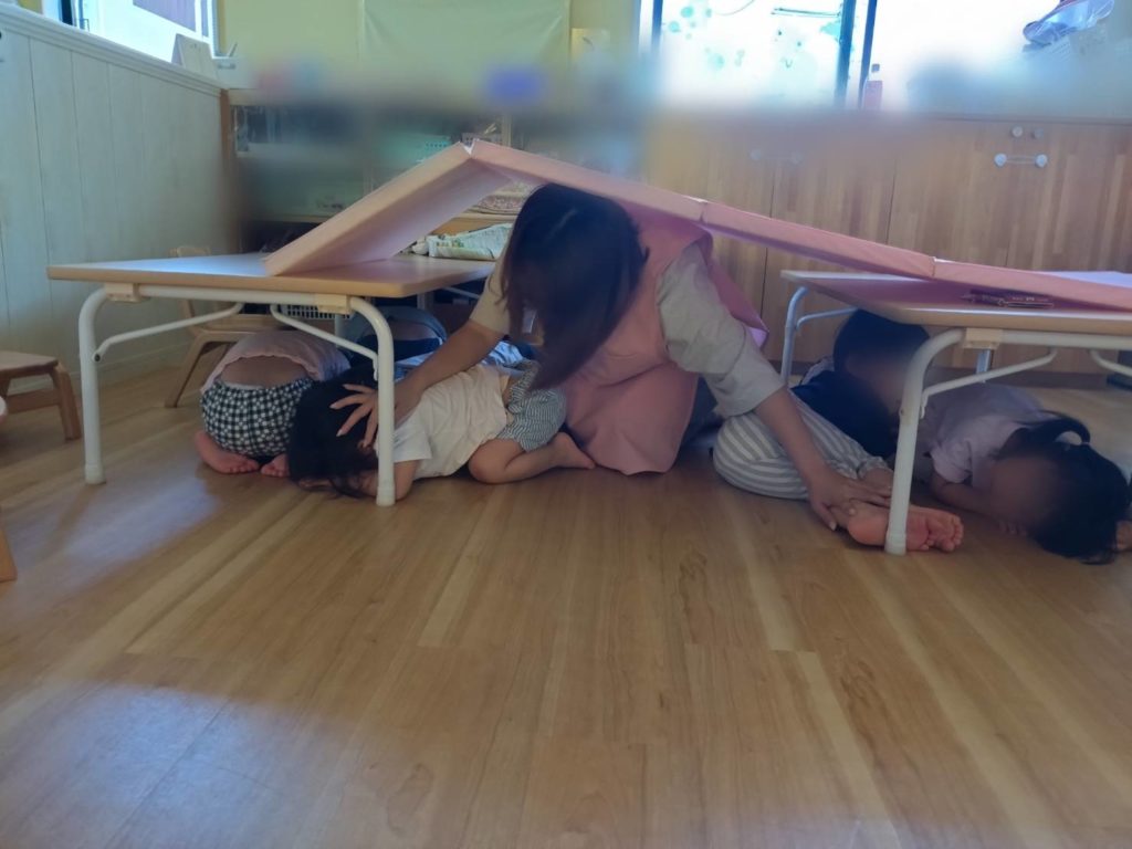 今回は、水遊びの準備をしていた時に地震の警報音が突然鳴る・・・と言う想定で行いました。