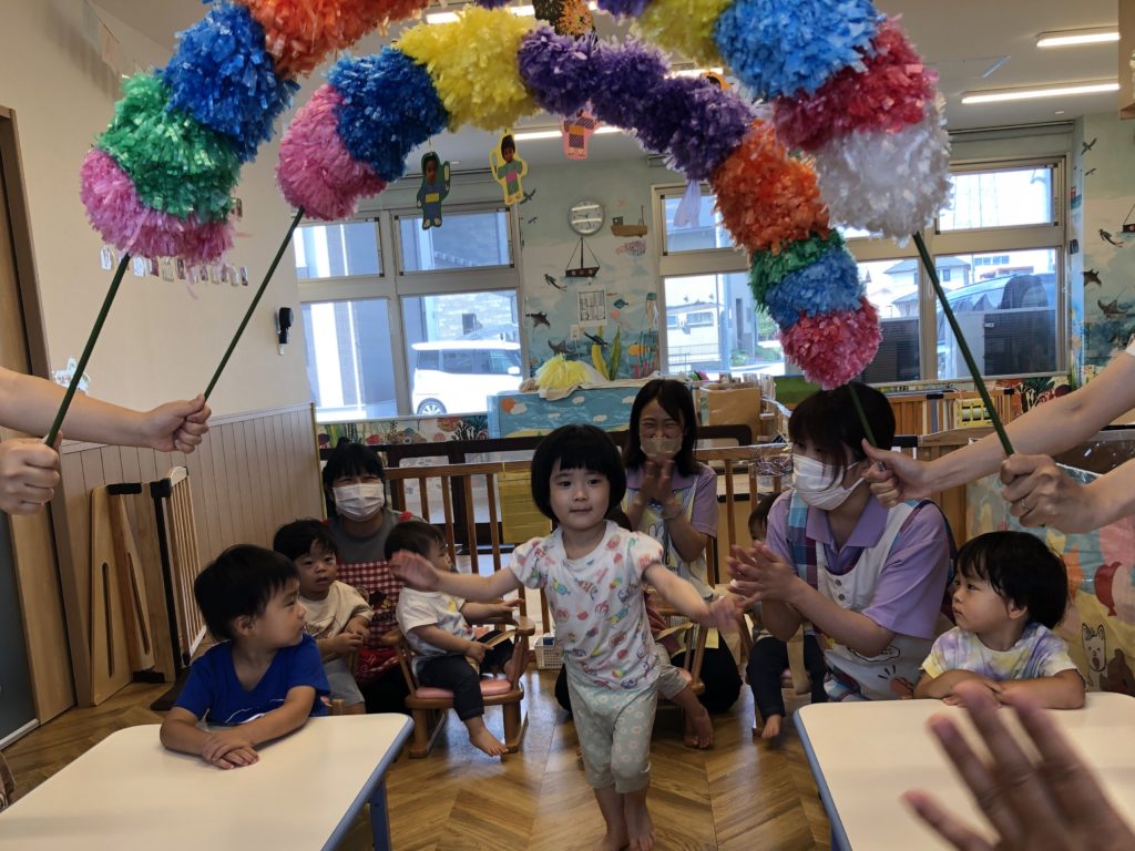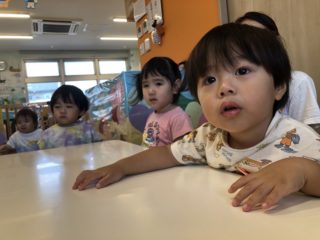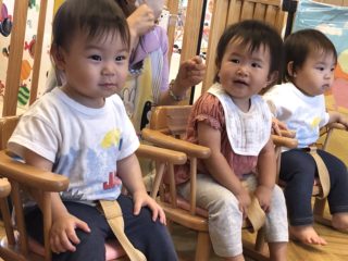 ニコニコしながら見ている2歳児さん、真剣な顔で見入っている1歳児さん、0歳児さんは音楽に合わせて体を揺らしたり手を叩いたり、とっても楽しそうでした♪