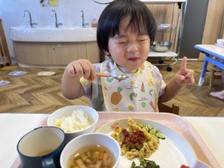 給食のお誕生日メニューは、ハンバーグと炒り卵の花びらで、大きなひまわりができていました!