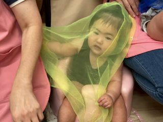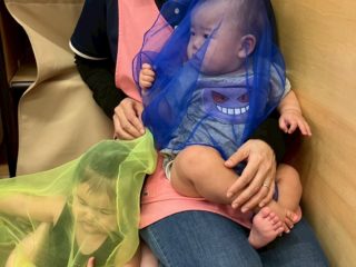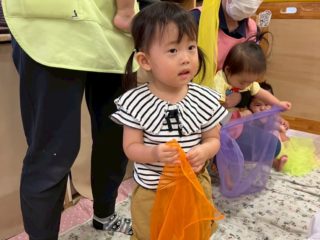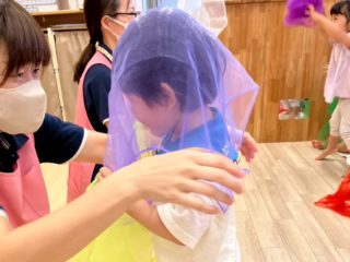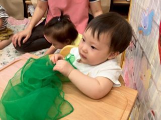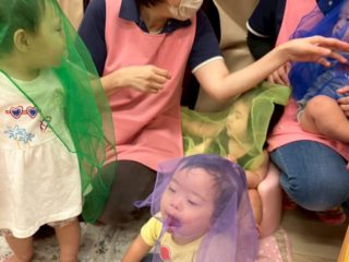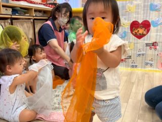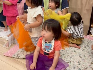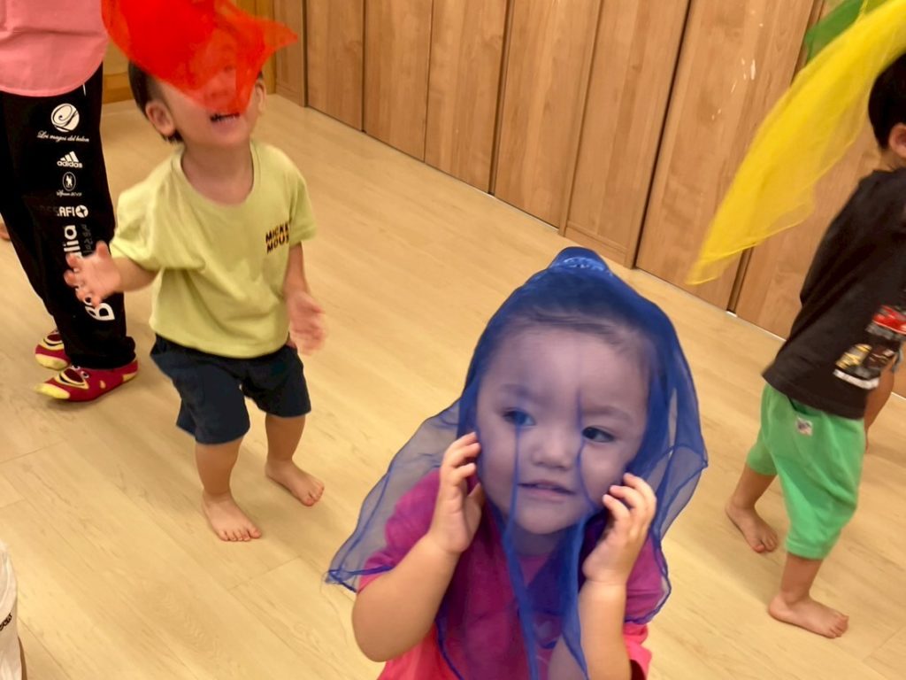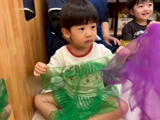 いろんな色のスカーフを音楽に合わせて自由に動かしながらとんぼの羽を表現することができました。