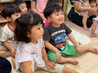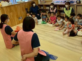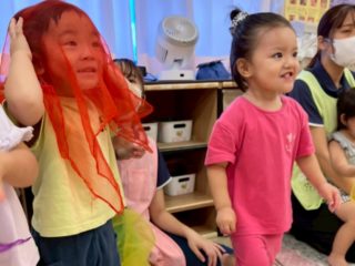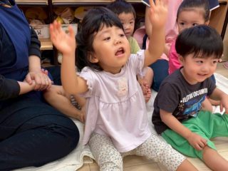 9月のリトミックは「おおきなたいこ」と「とんぼのめがね」を使って季節を感じながら体を動かすことができました。