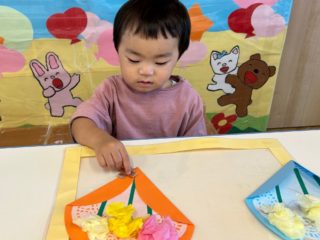 1歳児さんは、レースペーパーに絵を描き、お花紙をクシュクシュ丸めてのりで貼りました。