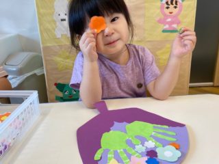 0歳児さんは、好きな色の絵の具を選んで手形を取って、画用紙のお花を好きな所に貼りました。
