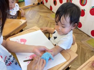 自分で絵の具を指につけたり、何度も紙にペタペタして楽しんでいました♪